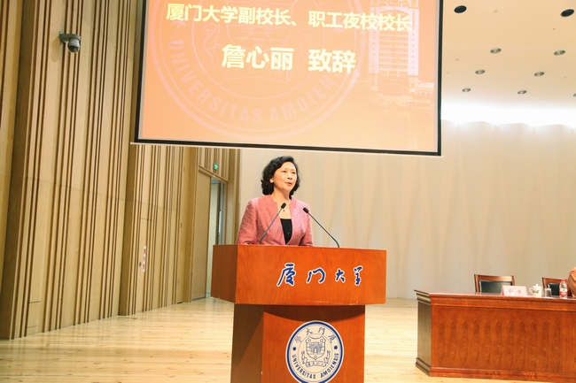 开学典礼在庄严的国歌声中拉开帷幕。詹心丽首先致欢迎辞,她代表全校师生对2014年网络教育和职工夜校新生表示热烈的欢迎。她以亲切朴实的话语,介绍了厦大的校园环境、优势学科、文化名人、杰出校友,马来西亚分校的筹办情况、职工夜校的办学愿景等,深入解读了厦大深厚的文化底蕴和独特的四种精神,并对学子们提出了殷切期望。