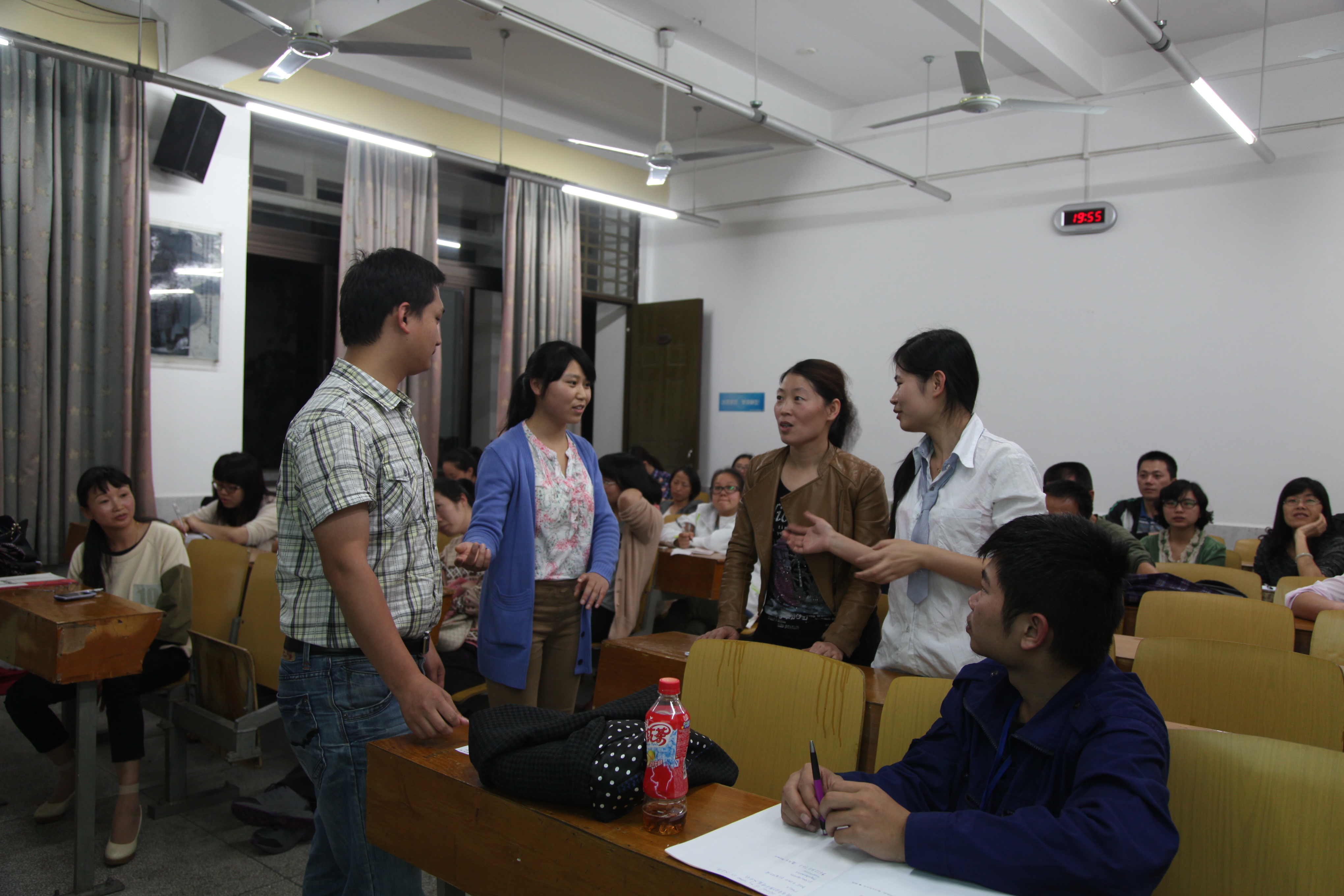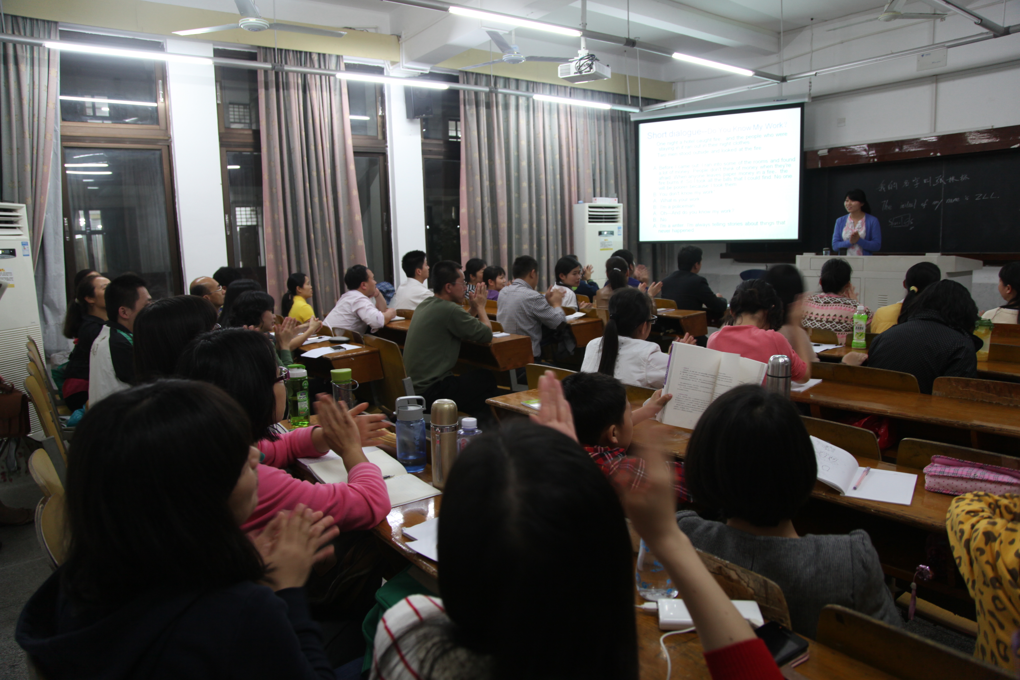 《商务英语》课是单班到场人数最多的课,教室现场座无虚席。英语班主要采用小班化教学,但由于目前听课人数较多,也考虑了到职工们英语程度的差异(据了解,参加英语学习的职工中,初中水平的大约有10人,高中水平的有5人,大专水平的有5人,四级考过了的有6人),任课志愿者也将在班级内部进行小组划分,每堂课实行“集中学习+小组对话”模式进行。
